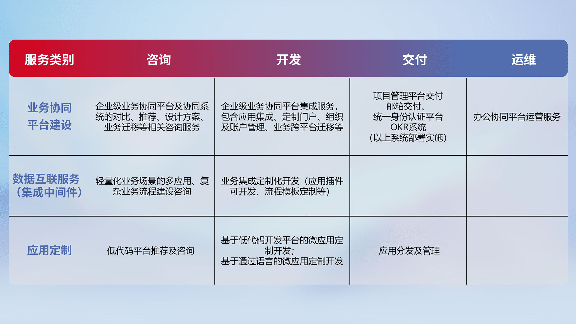 针对钉钉、、企微、、、IDaas等平台级产品提供产品的规划、、、方案、、、交付、、、、定制化开发等服务,,,实现如统一协同办公、、、智能客户服务、、混合会议管理、、智能数据查询、、等业务场景,,,实现数字化转型。。